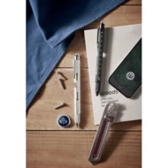 Długopis ze stali nierdzewnej z poziomicą, linijką, rysikiem i końcówką śrubokrętu krzyżakowego i płaskiego oraz z diodą LED. 3 baterie AG w zestawie. Niebieski tusz.