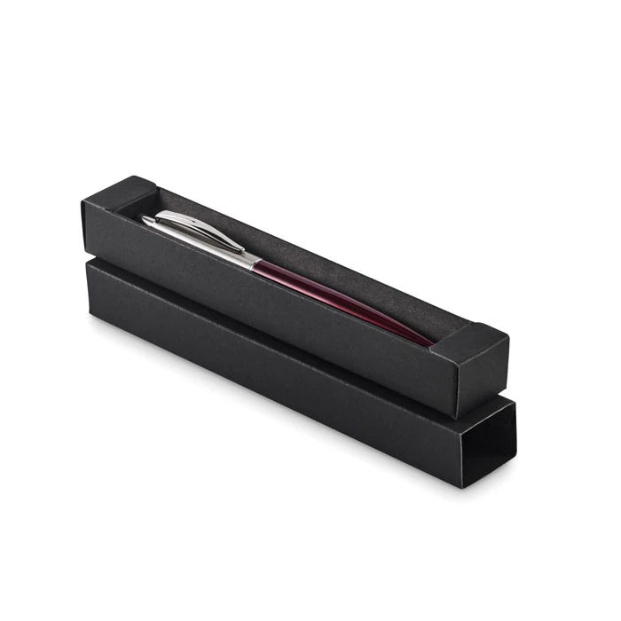 Przyciskany długopis z korpusem z recyklingowanej stali nierdzewnej. Niebieski tusz. Prezentowany w czarnym pudełku.