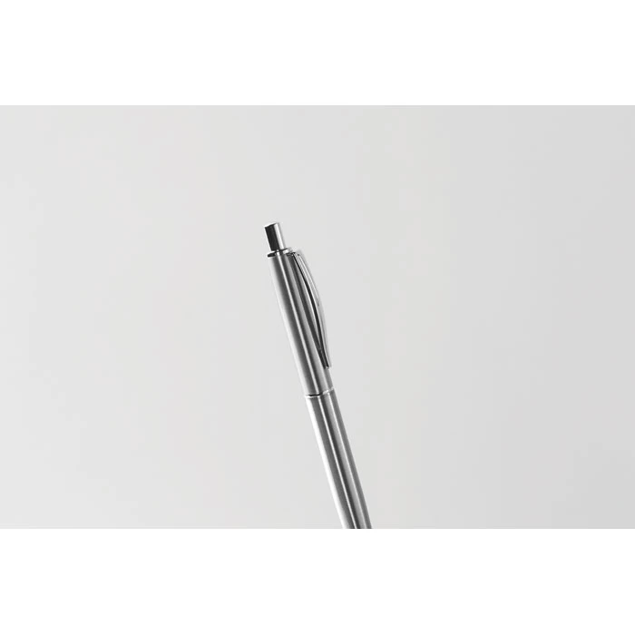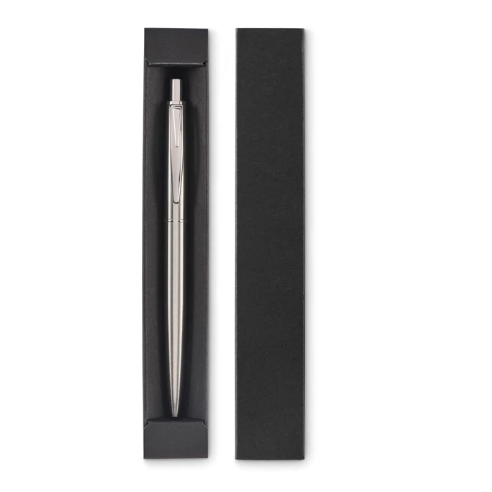 Przyciskany długopis z korpusem z recyklingowanej stali nierdzewnej. Niebieski tusz. Prezentowany w czarnym pudełku.