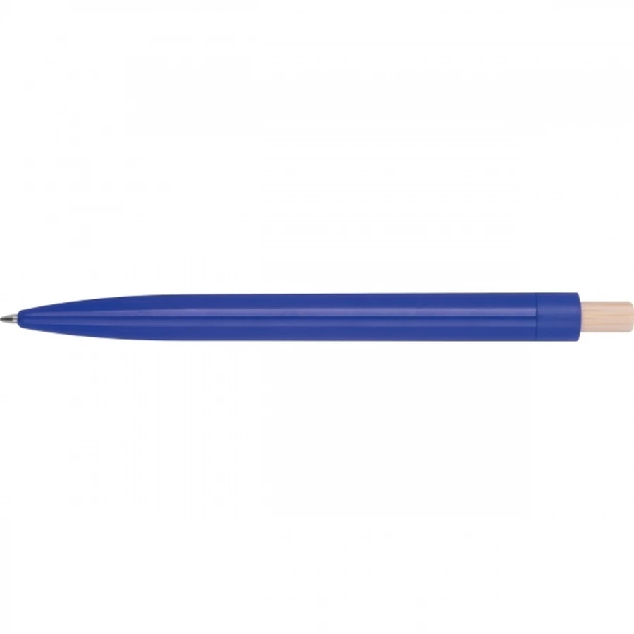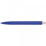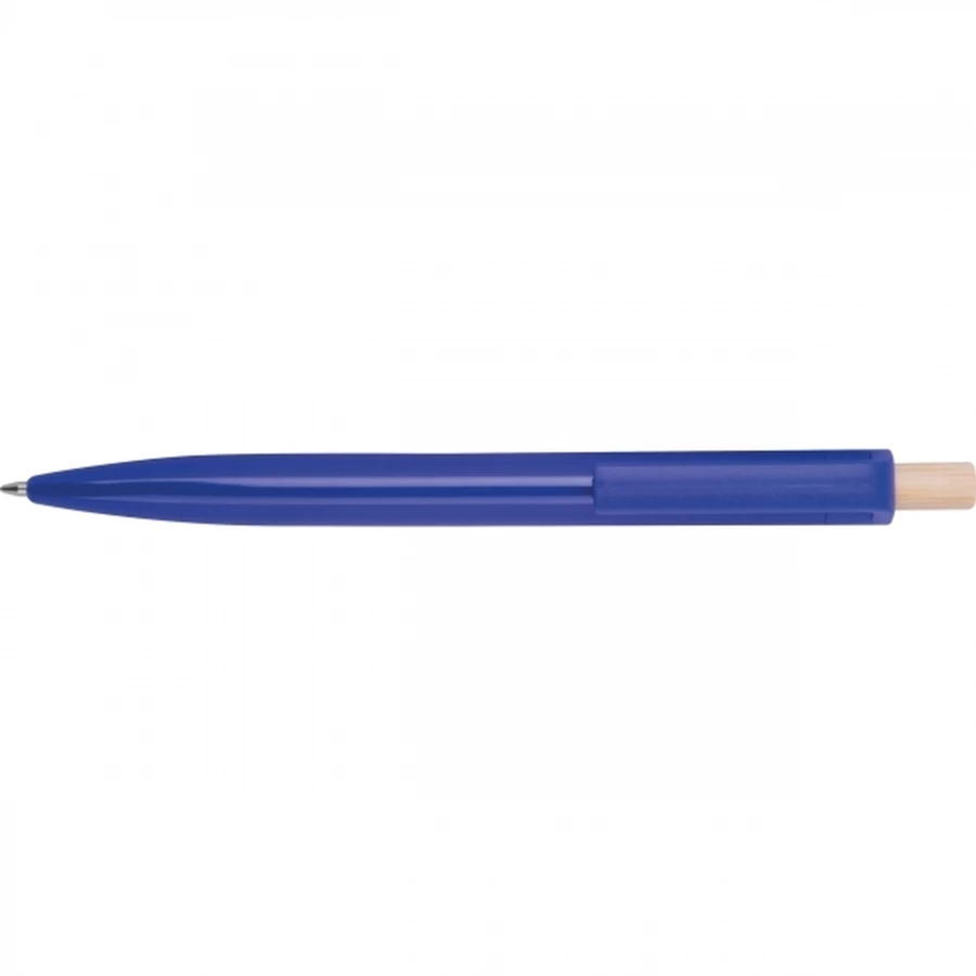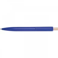 Długopis wykonany z recyklingowego ABS z bambusowym przyciskiem. Ma niebieski plastikowy wkład.