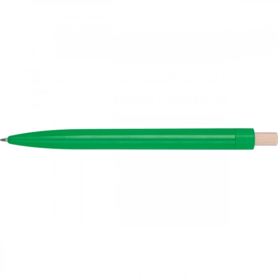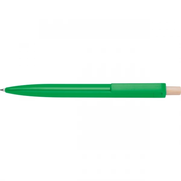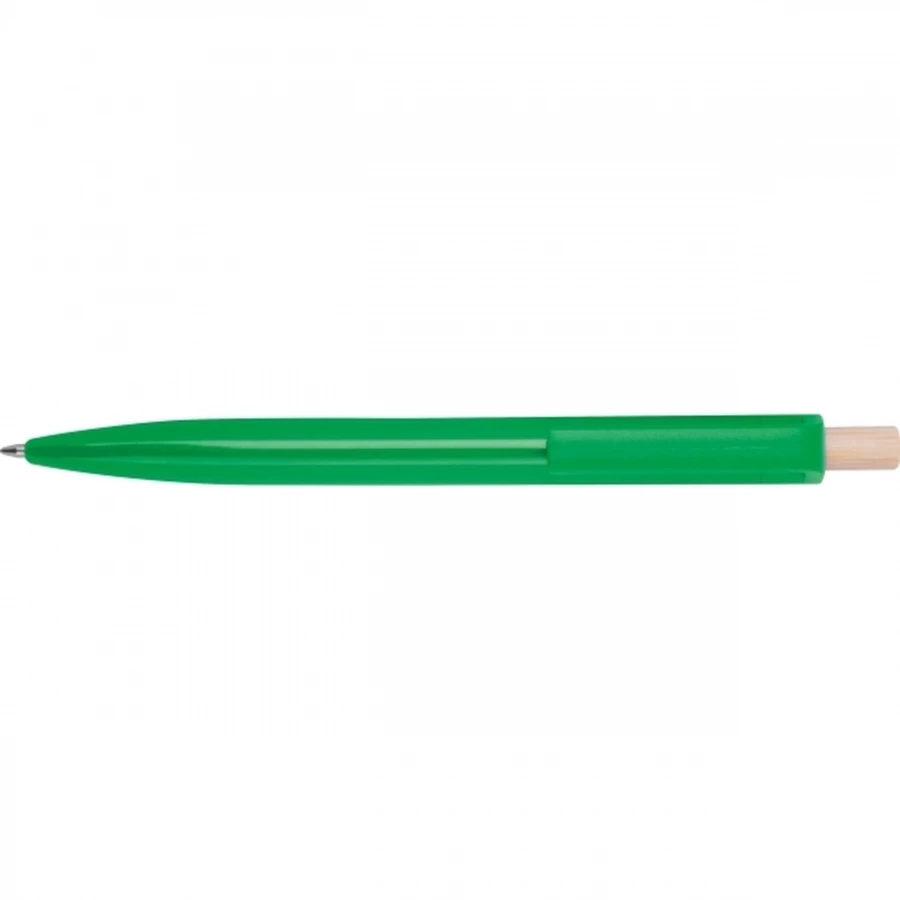 Długopis wykonany z recyklingowego ABS z bambusowym przyciskiem. Ma niebieski plastikowy wkład.