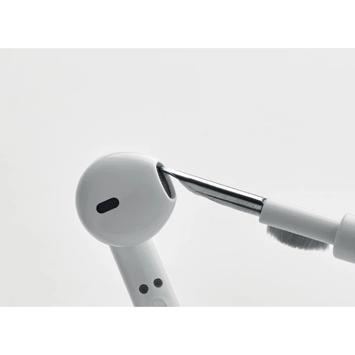 Długopis z zestawem do czyszczenia TWS. Posiada zestaw do czyszczenia wkładek dousznych True Wireless Stereo (TWS): metalowy wkład, gąbkę i pędzelek. Niebieski tusz.