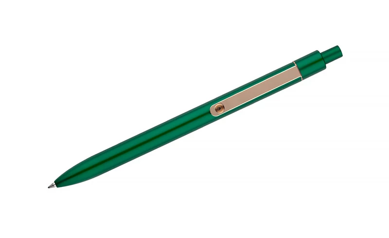 Stylowy długopis aluminiowy z matowym wykończeniem i klipem w kolorze złotym.