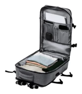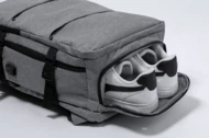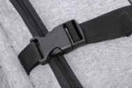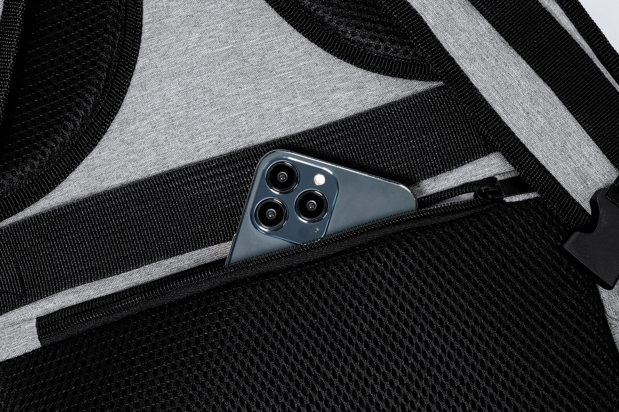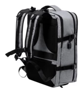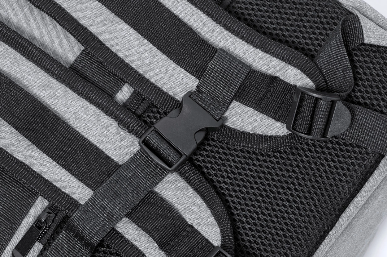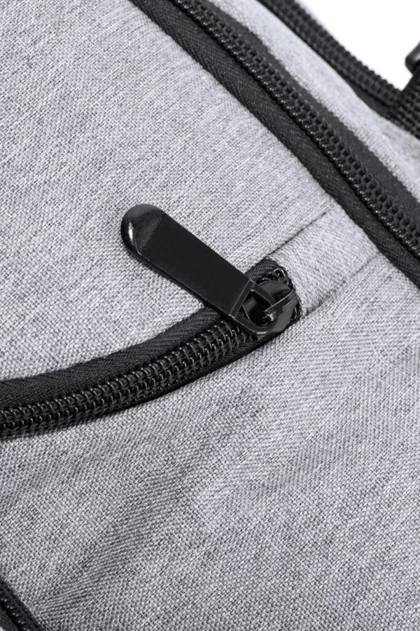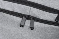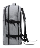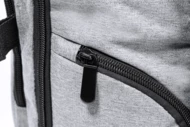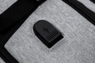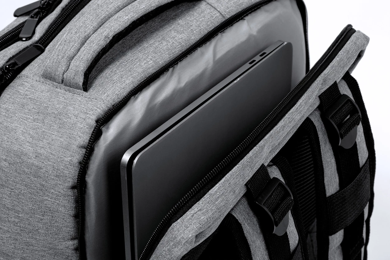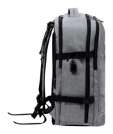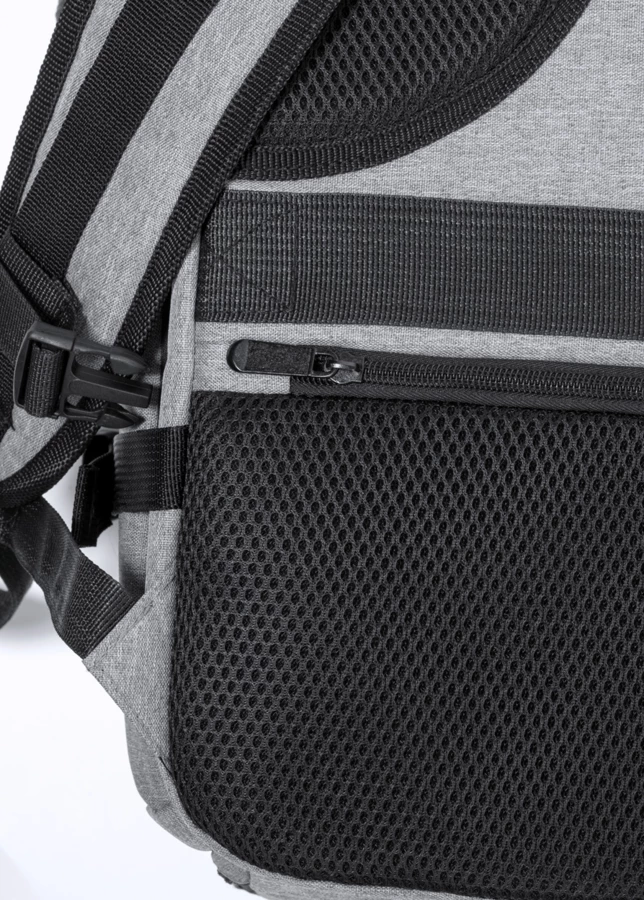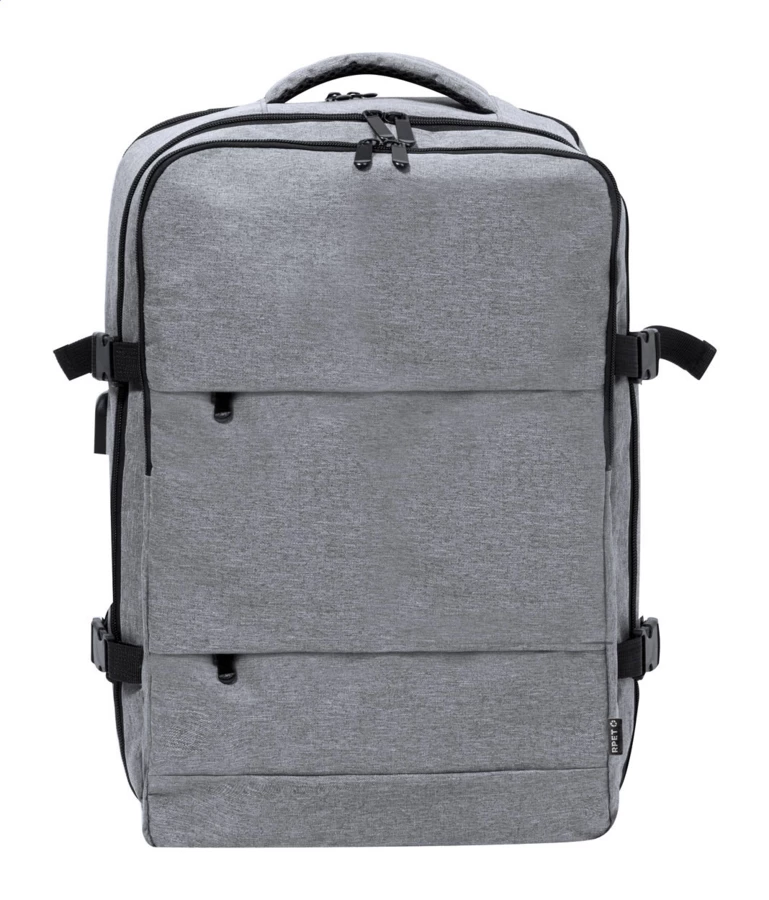 Wodoodporny plecak RPET z 3 zapinanymi na zamek głównymi przegrodami, 2 zapinanymi na zamek kieszeniami z przodu, zapinaną na zamek kieszenią boczną i ukrytą kieszenią antykradzieżową. Z wyściełanymi przegrodami na laptopa (17") i buty, wyściełanym tyłem i paskami na ramiona. Z paskiem na wózek i wbudowanym złączem USB do power banków. Poliester RPET 300D z charakterystyczną etykietą RPET.