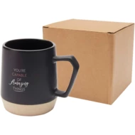 Stylowy ceramiczny kubek z nieszkliwionym dnem. Można myć w zmywarce. Zapakowana w pudełko upominkowe wykonane z kartonu z recyklingu. Pojemność: 300 ml.