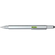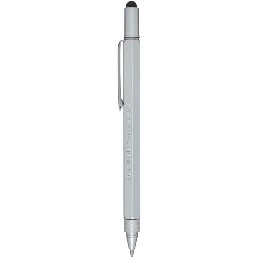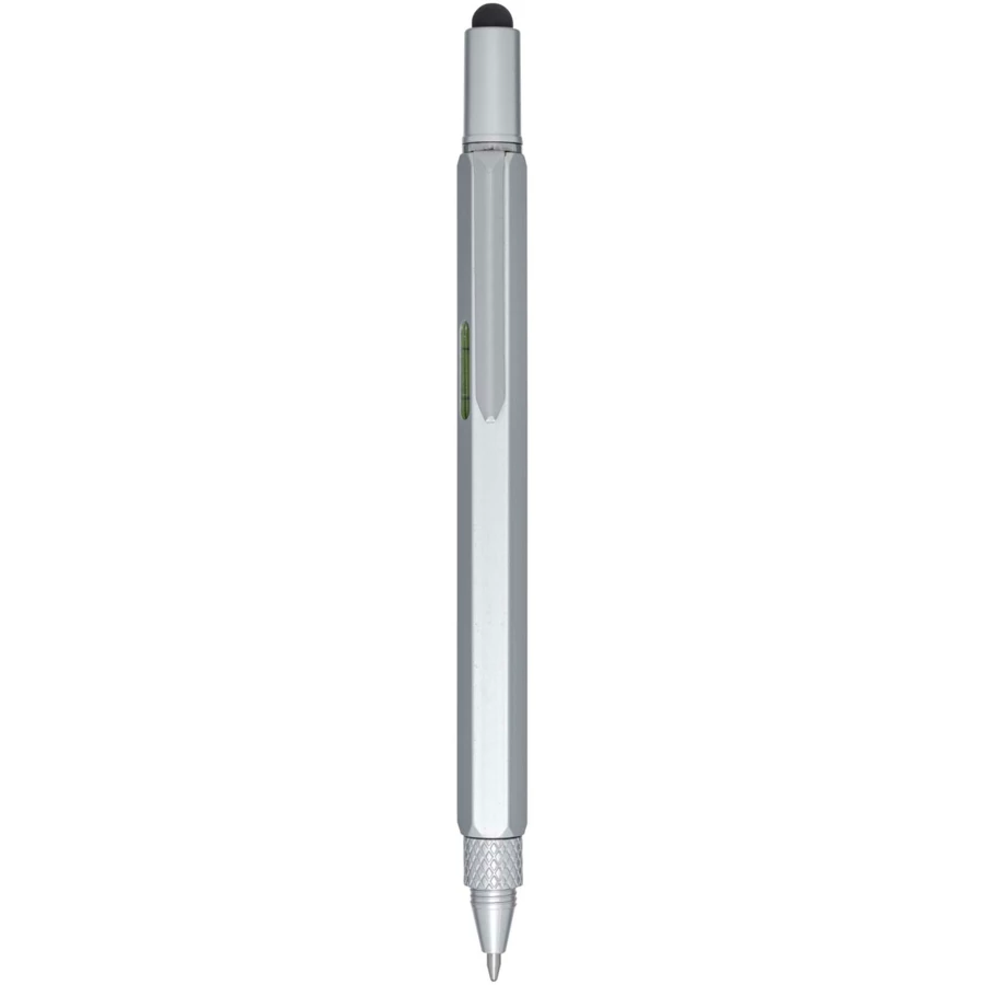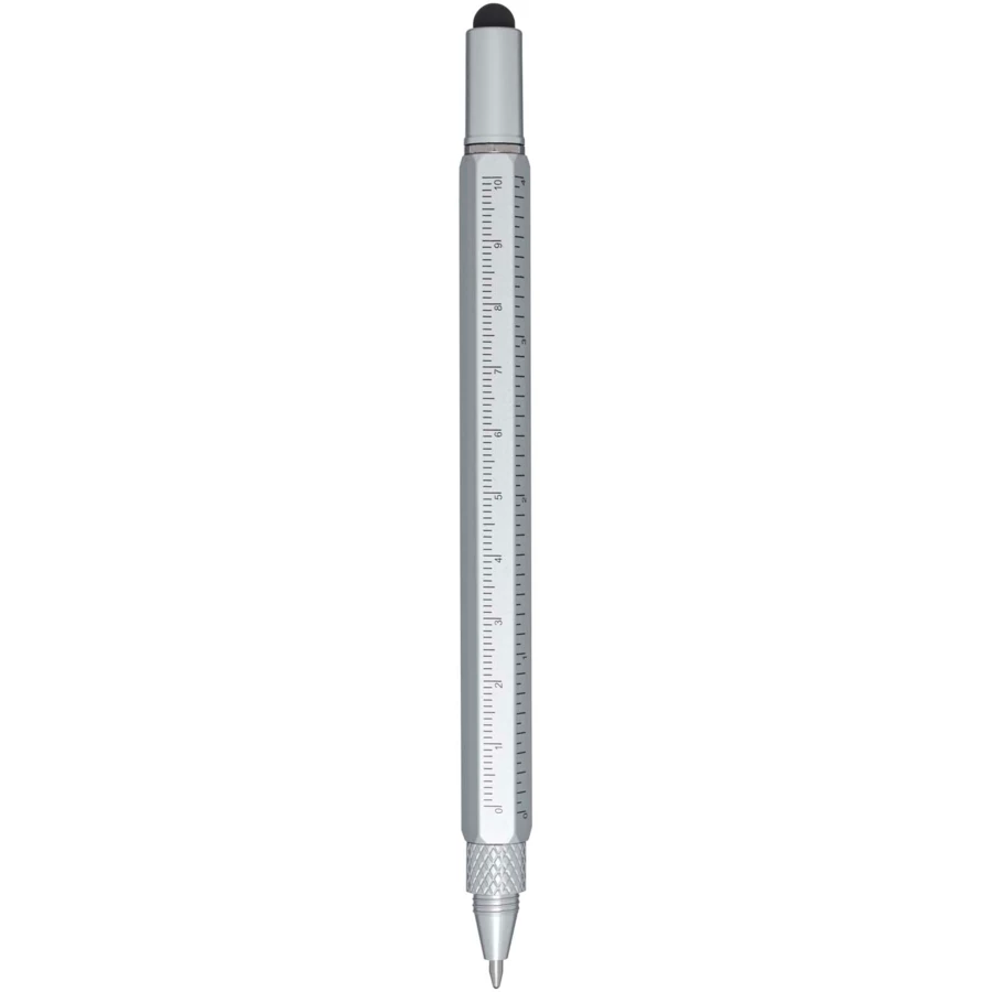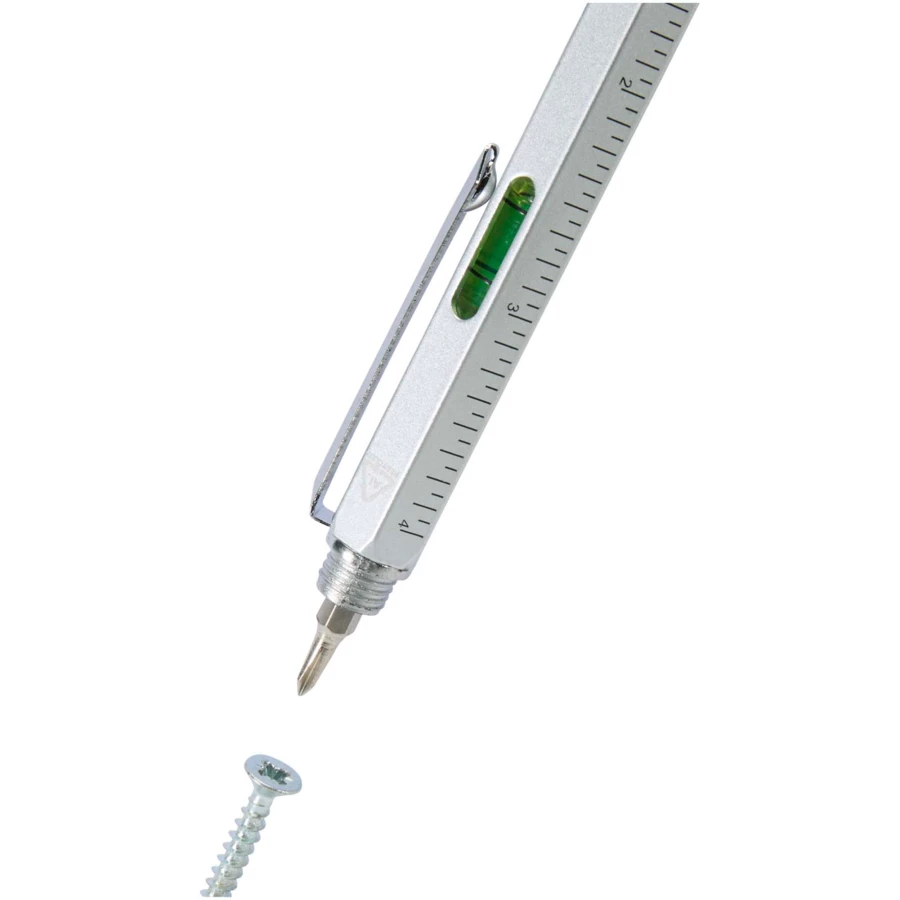 Dora aluminiowy wielofunkcyjny długopis wykonany częściowo z materiałów pochodzących z recyklingu, wyposażony w dwustronną linijkę, dźwignię, śrubokręt, podziałkę i czarny rysik wykonany z gumy. Korpus został wykonany z aluminium pochodzącego z recyklingu i pokryty srebrną powłoką natryskową. Klips wykonany jest z żelaza. Śrubokręt jest wykonany ze stali. Górna część i końcówka są wykonane z RABS. Kolor tuszu: Czarny. Żywotność: 400 metrów. Rozmiar stalówki: 1,0 mm.