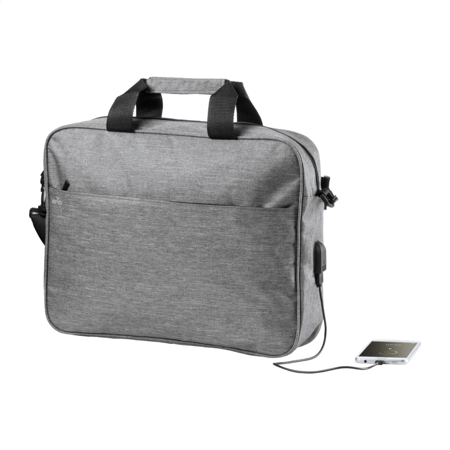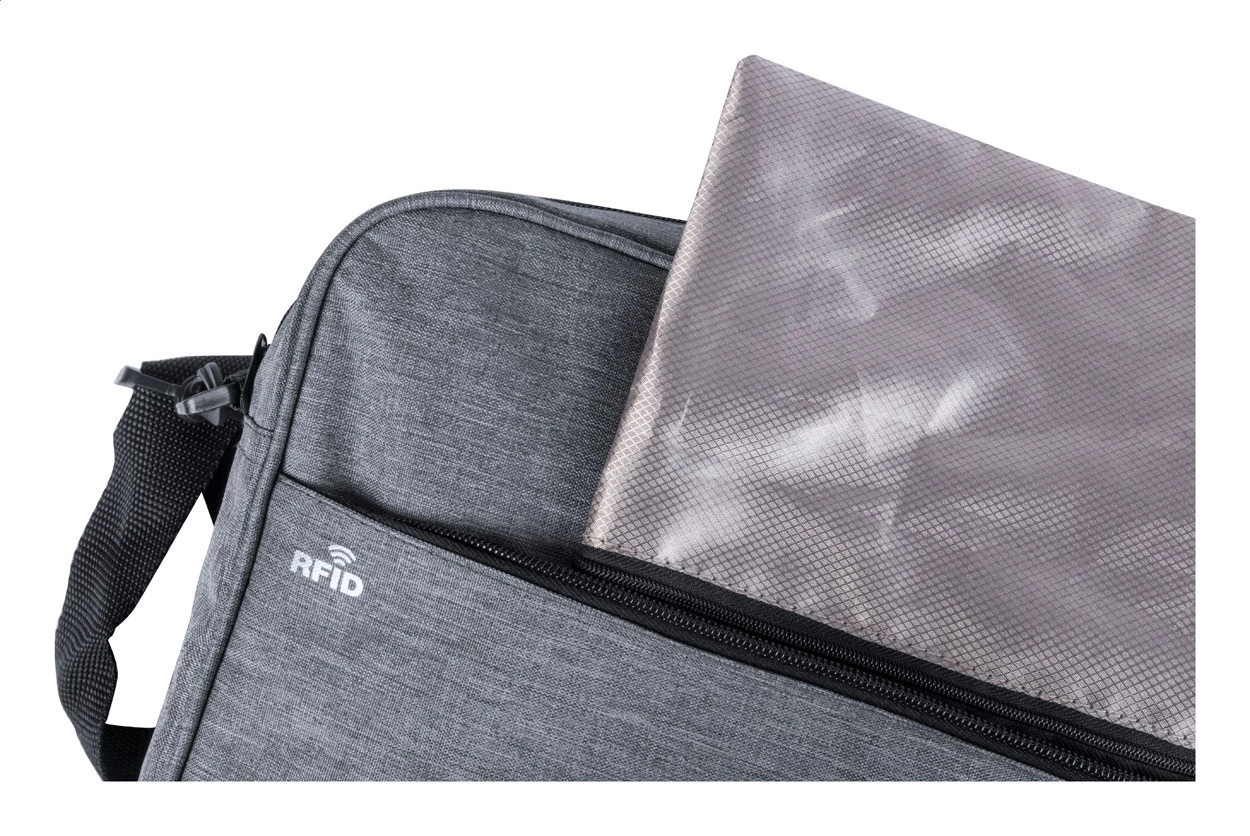 Torba z zabezpieczeniem RFID, z wyściełaną przegrodą na laptopa i tablet (15"i 10"), wyściełanymi plecami i paskiem na ramię. Z wbudowanym złączem USB dla powerbanków. Poliester 300D.
