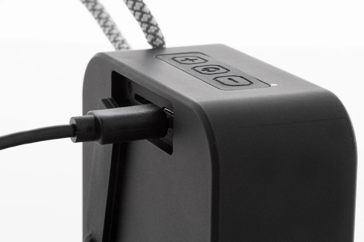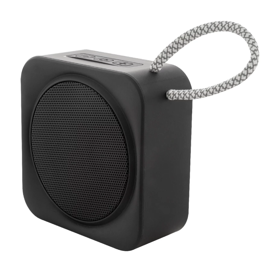 Głośnik bezprzewodowy z recyklingowanego ABS z paskiem do noszenia, metalową siateczką i akumulatorem (300 mAh). Z funkcją odtwarzania plików MP3 z karty micro SD. W zestawie kabel USB do ładowania.