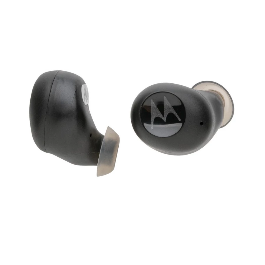 Douszne słuchawki bezprzewodowe Motorola BT 2.0, wodoodporne IPX5 (całkowita ochrona przed strumieniem wody płynącej z różnych kierunków z wydajnością do 12,5 litra na minutę), funkcja odbierania połączeń, panel dotykowy, do 6 godzin odtwarzania na jednym ładowaniu, etui ładujące posiada wystarczającą ilość energii na kolejne 12 godzin odtwarzania, kompatybilne z asystentami głosowymi (Siri®, asystent Google™, Alexa), ślad węglowy produktu: 0,62 kg CO2