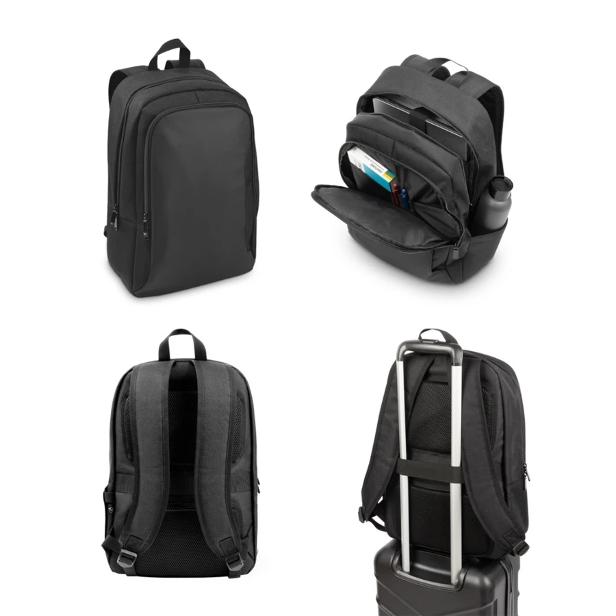 Plecak na laptopa z poliestru z recyklingu o wysokiej gęstości 600D, przód z poliestru z recyklingu o wysokiej gęstości 900D z powłoką odporną na wodę i podszewką z poliestru z recyklingu 210D. Główna komora z wyściełaną przegrodą na laptopy do 17.3" i przestronną kieszenią przednią z kilkoma wewnętrznymi kieszeniami. Boczna kieszeń idealna do noszenia butelki i pleców z dodatkowym wyściełaniem i paskiem na wózek. Pojemność do 24 l. 320 x 470 x 180 mm