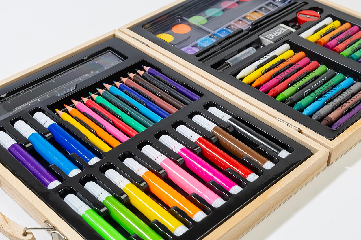 Kompleksowy, 66-elementowy zestaw do rysowania i kolorowania dla artystów w drewnianym pudełku. Zawiera: 12 kredek świecowych, 12 pasteli olejnych, 12 ołówków, 12 markerów, 12 farb akwarelowych z paletą i pędzlem, linijkę, gumkę, temperówkę i klej.