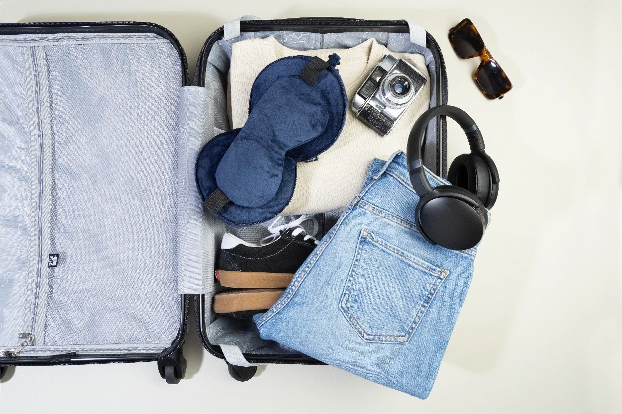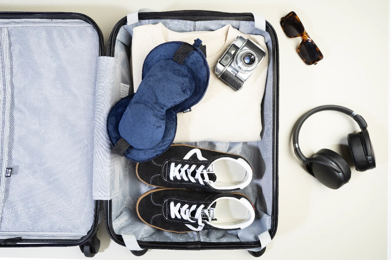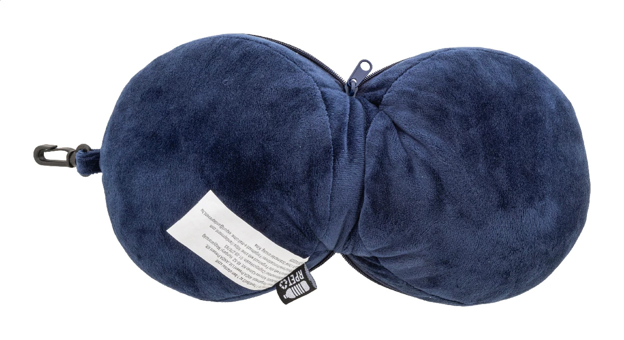 Poduszka podróżna z poliestru RPET ze zintegrowaną maską na oczy i elastycznymi paskami. Zapinana na suwak, tworzy kompaktową kulę, co ułatwia przechowywanie. W zestawie karabińczyk PP do przymocowania do bagażu. Z charakterystyczną etykietą RPET.