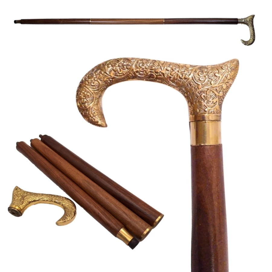 Drewniana Laska do chodzenia ze złotą rączką - Składana - DNU-012A