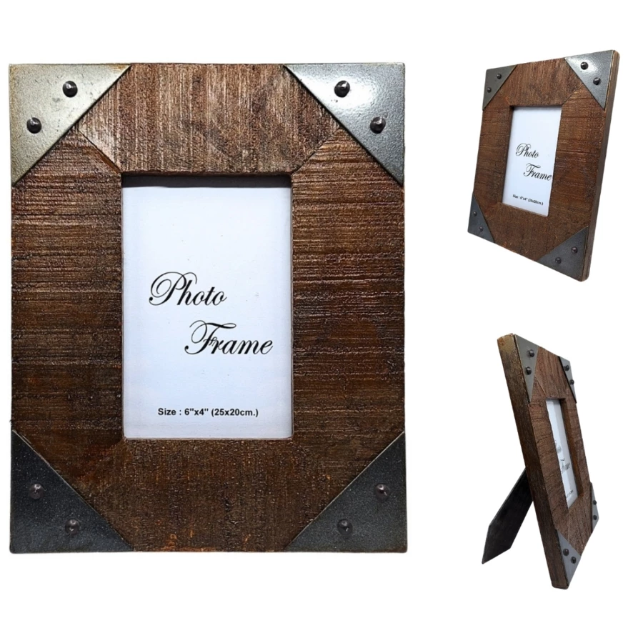 Ramka na zdjęcia wykonana z naturalnego drewna mangowego wzbogacona dekoracyjnymi metalowymi okuciami. Idealna do ekspozycji ulubionych wspomnień.