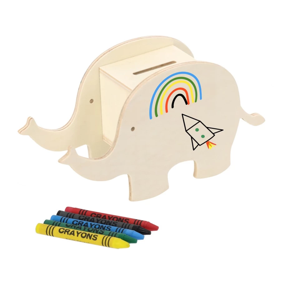 Skarbonka do kolorowania w kształcie zwierzątka (17A-niedźwiadek, 17B-słoń), 5 kredek świecowych w zestawie, produkt wykonany z drewna