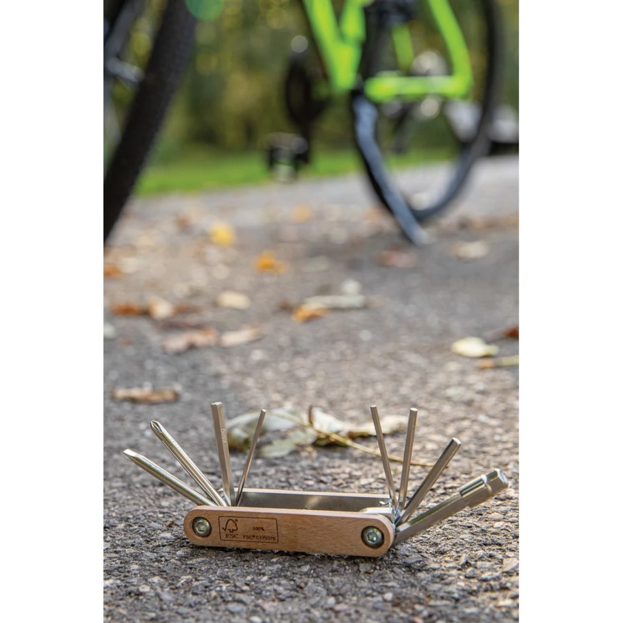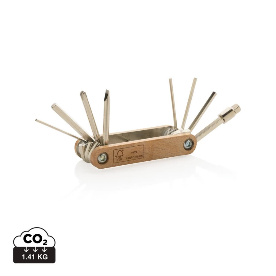 Narzędzie wielofunkcyjne, wykonane z drewna z certyfikatem FSC® i stali węglowej, funkcje: klucze imbusowe 5,5mm, 2mm, 2,5mm, 3mm, 4mm, 5mm, 6mm, śrubokręt krzyżakowy, śrubokręt płaski, w ozdobnym pudełku z papieru kraftowego z certyfikatem FSC®, ślad węglowy produktu: 0,69 kg CO2