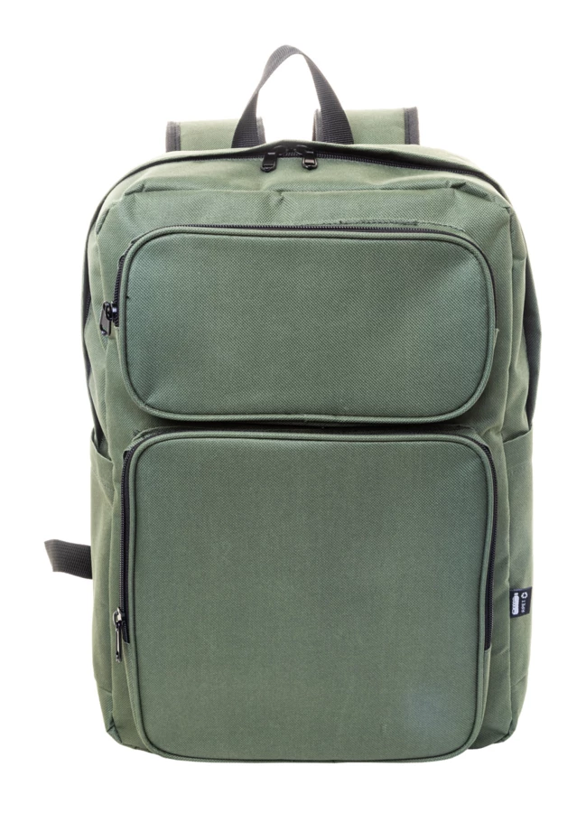 Plecak RPET z główną komorą na suwak, 2 kieszeniami z przodu na suwak, kieszeniami bocznymi i wyściełaną przegrodą na laptopa (15") i tablet (10"). Z wyściełanym tyłem i paskami na ramiona. Poliester RPET 600D, z charakterystyczną metką RPET.