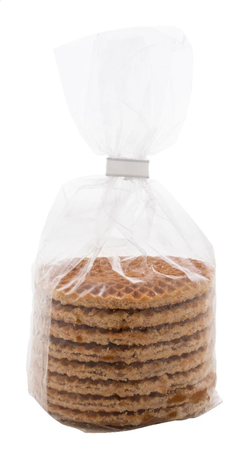 Oryginalne holenderskie stroopwafle (dwa cienkie wafle wypełnione kremowym syropem karmelowym) pakowane w plastikowe torebki. 8 sztuk, 250 gramów. Możliwość personalizacji za pomocą naklejki winylowej lub full kolorowego, zadrukowanego pudełka prezentowego. Cena nie obejmuje personalizacji.