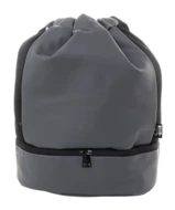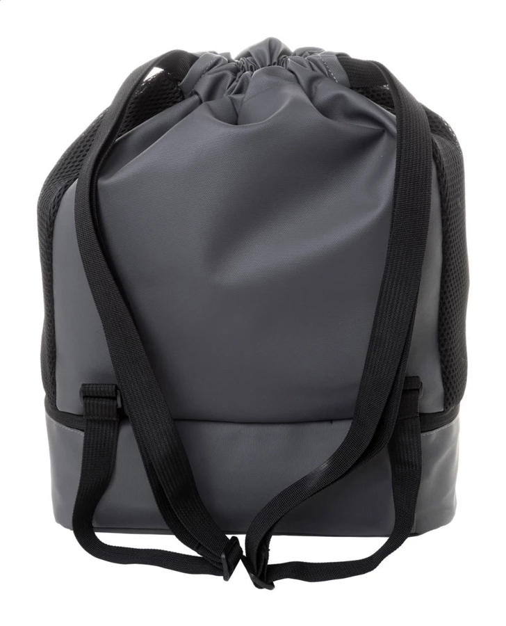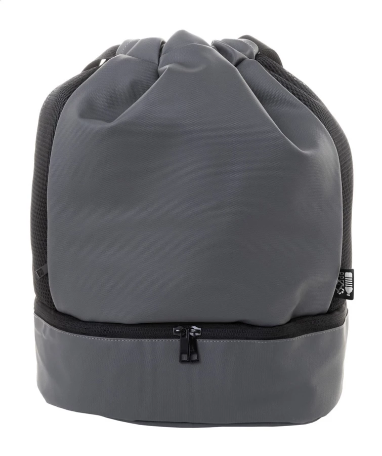 Worek ze ściągaczem RPET z przegrodą na buty zapinaną na suwak, siateczkowymi wstawkami bocznymi i szerokimi paskami. Poliester RPET 600D powlekany poliuretanem z charakterystyczną metką RPET.