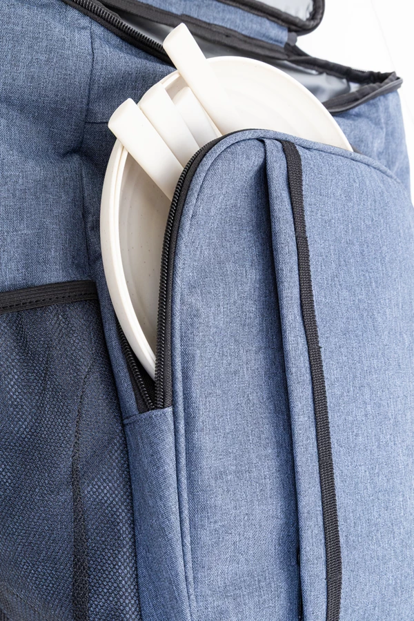 Plecak termiczny RPET z kieszenią przednią zapinaną na zamek i komorą termiczną zapinaną na zamek, z wyściółką PEVA. Z siateczkowymi kieszeniami bocznymi, wyściełanym tyłem i paskami na ramię. W zestawie sztućce z PP i stali nierdzewnej dla 2 osób: 2 talerze, 2 kubki, 2 widelce, 2 łyżki i 2 noże. Poliester 600D RPET, z charakterystyczną metką RPET.