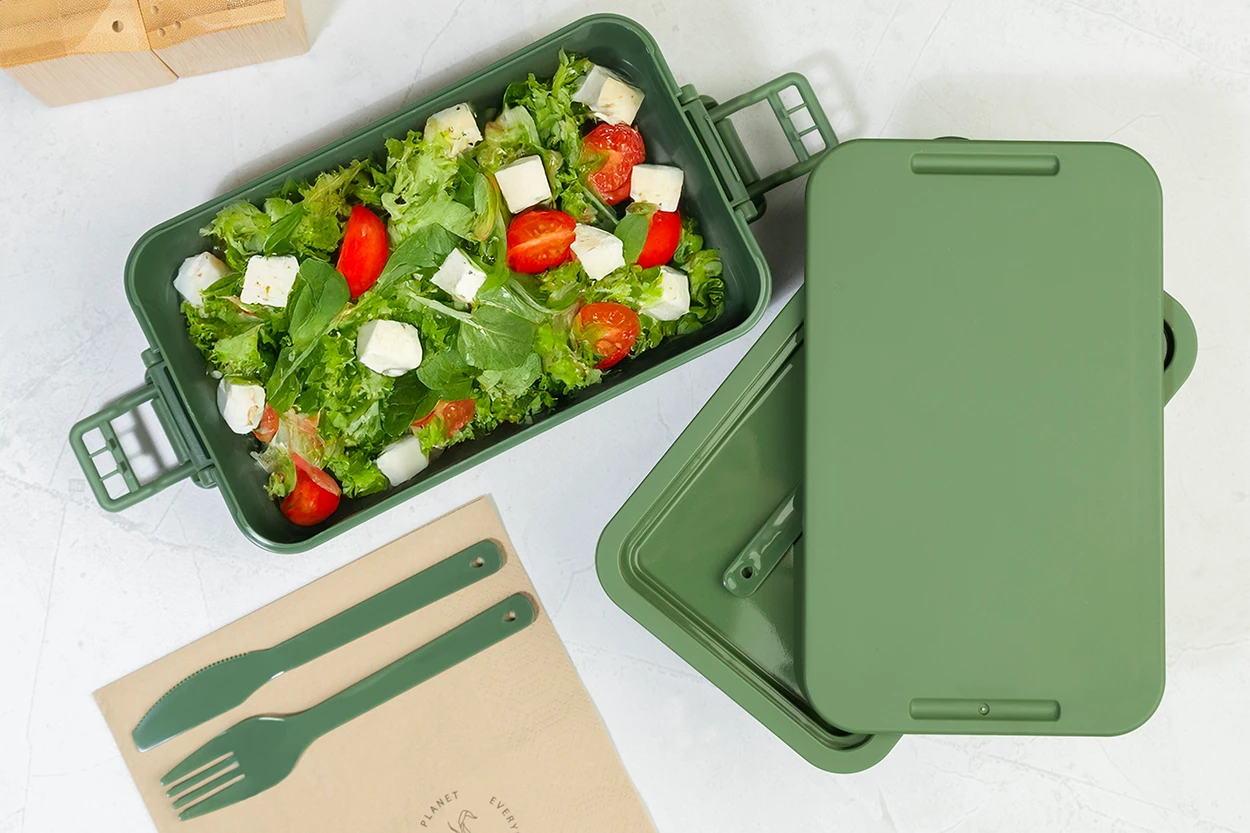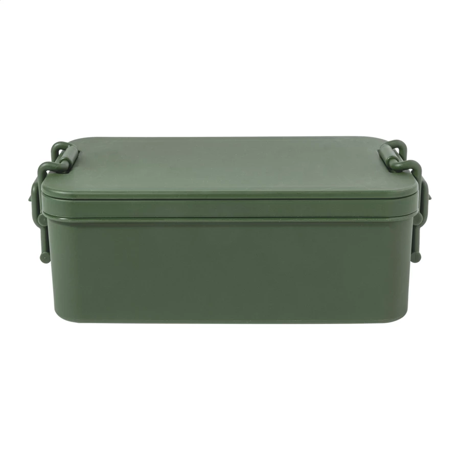 Lunchbox z tworzywa PP z zestawem sztućców (widelec, łyżka i nóż), zapięciem na klamrę i 2 przegrodami (1000 ml i 800 ml). Możliwość układania w stosy, co zapewnia kompaktowe przechowywanie.