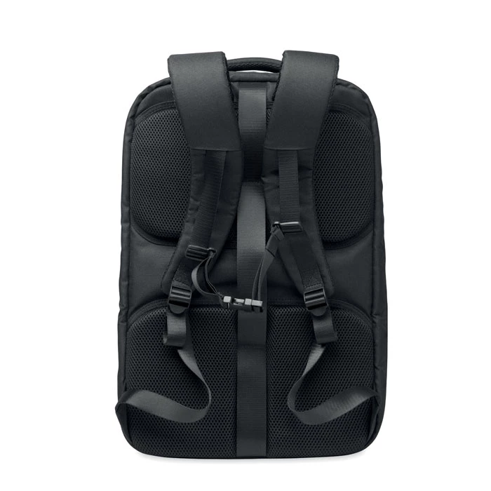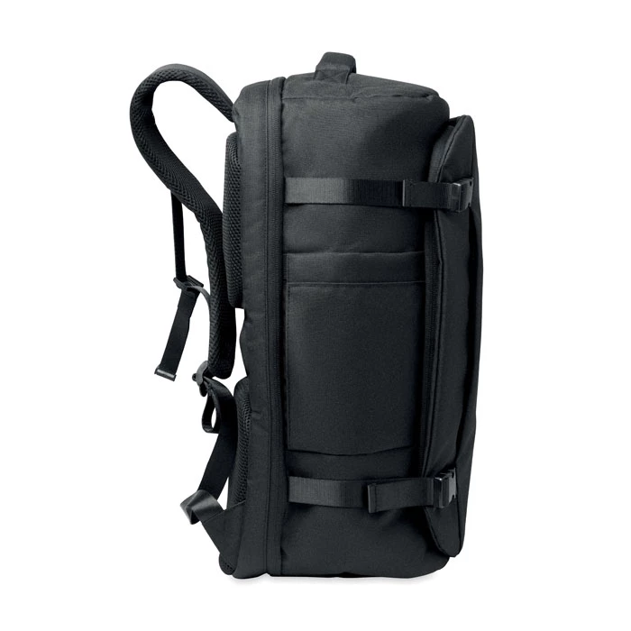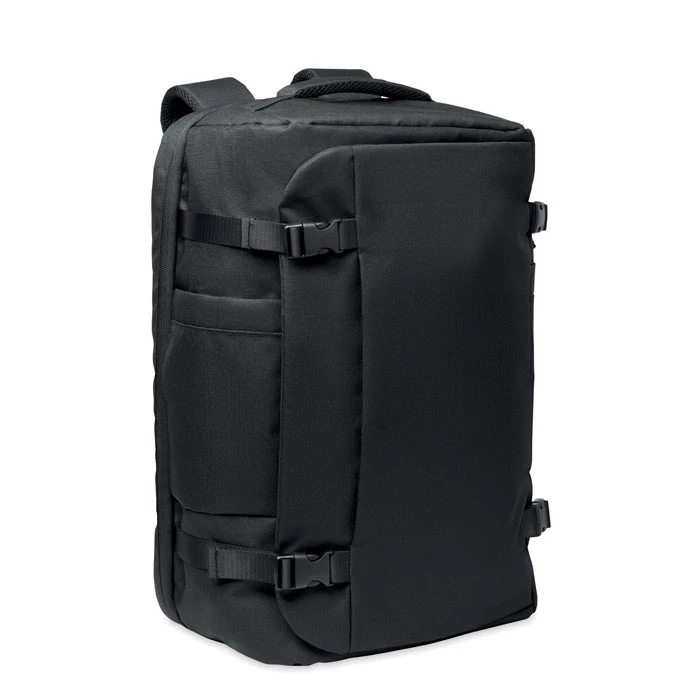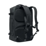 Duży, 17-calowy plecak podróżny na laptopa wykonany z poliestru 600D RPET. Posiada kilka przegródek, w tym jedną główną na ubrania, dwie wyściełane na laptopa i tablet. Wyściełany panel tylny, pasek na ramię, uchwyt.