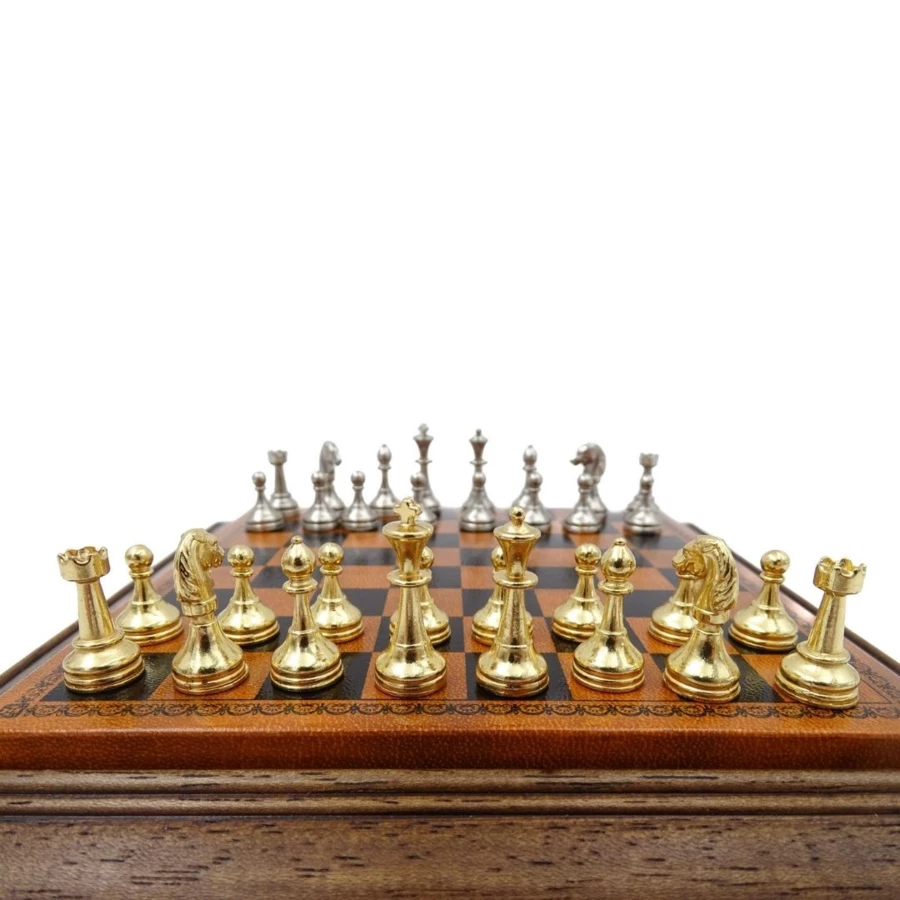 • Materiały: drewno, materiały skóropodobne (top szachownicy), figury metalowe