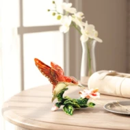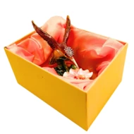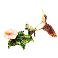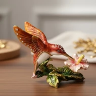 Ekskluzywne pudełko na skarby w kształcie kolibra to wyjątkowa, elegancka dekoracja, która przyciąga wzrok swoim oryginalnym designem i biżuteryjnym wykończeniem. Wykonane z metalu i zdobione błyszczącymi kryształkami, zachwyca zarówno jako ozdoba, jak i praktyczna szkatułka na drobne przedmioty. Jego otwierana konstrukcja sprawia, że świetnie nadaje się do przechowywania niewielkiej biżuterii, pamiątek czy innych małych skarbów.
