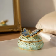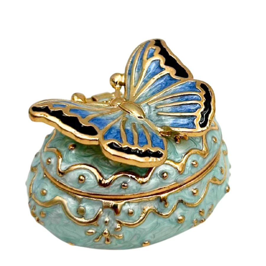 Ekskluzywne pudełko na kosztowności w kształcie motylka. Wykonane z metalu, szkliwa i kryształków, zachwyca subtelnym blaskiem i kunsztownymi detalami. Idealne jako ozdoba wnętrza lub urocza szkatułka na biżuterię i drobne skarby.
