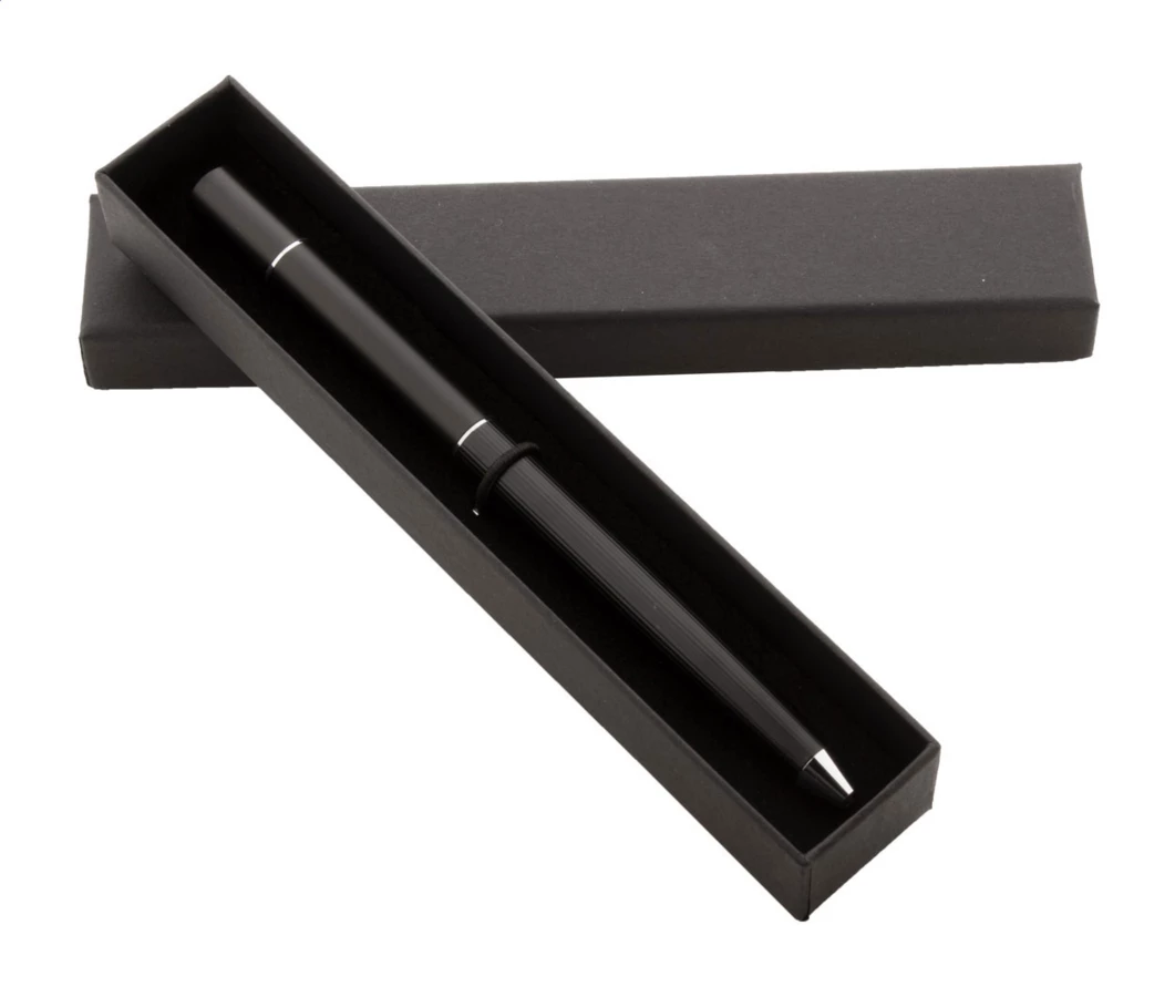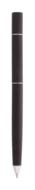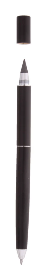 Metalowy długopis 2w1 z jednej strony posiadający przekręcaną tradycyjną końcówkę a z drugiej bezatramentową. W czarnym pudełku upominkowym. Z niebieskim wkładem i końcówką ze stopu metalu, który utlenia papier.