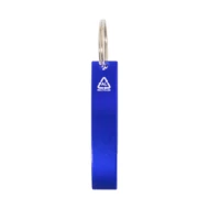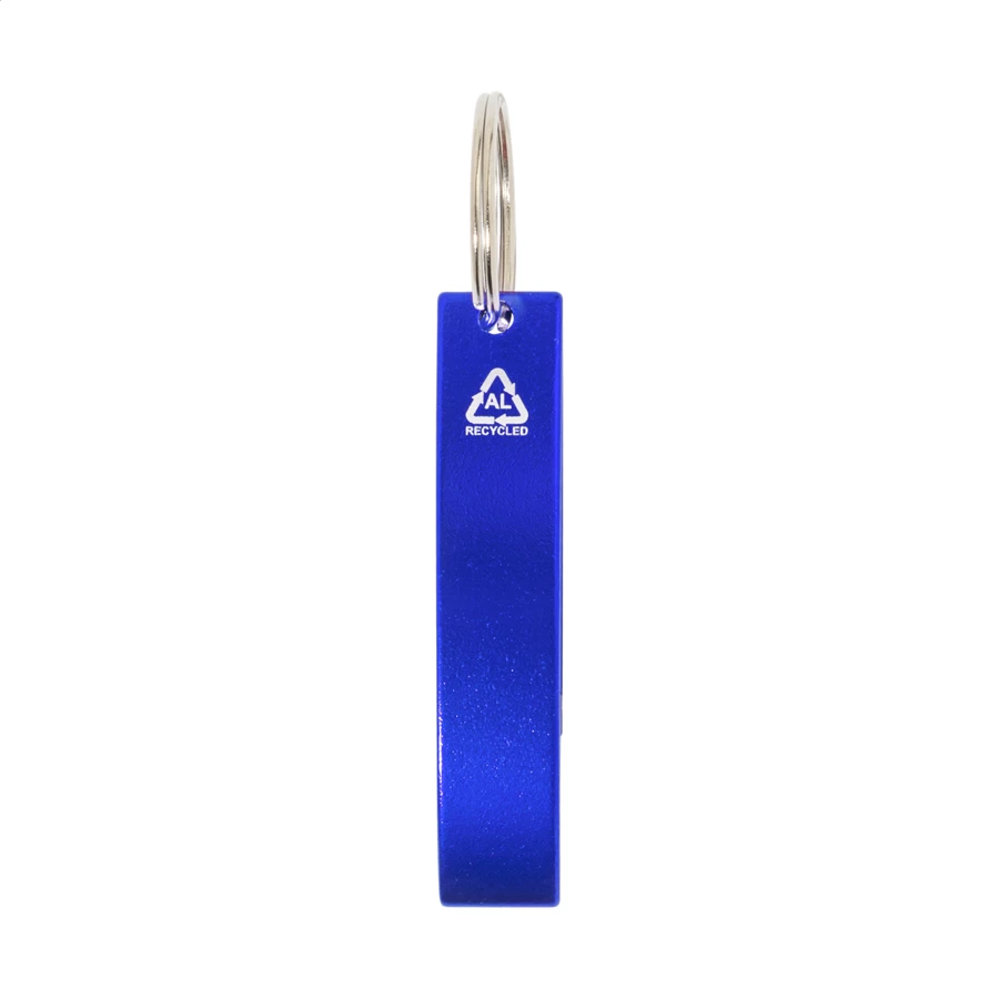 Otwieracz do butelek wykonany z recyklingowanego aluminium z metalowym brelokiem.