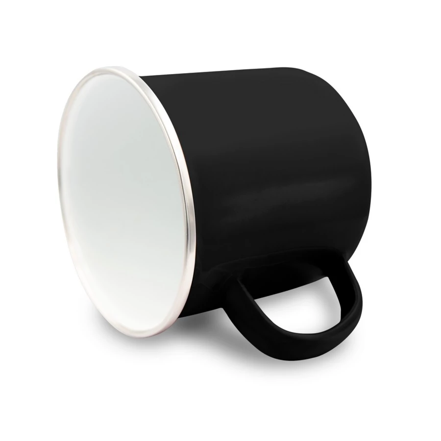Emaliowany kubek 360 ml o błyszczącym wykończeniu, posiada białe wnętrze oraz krawędź w kolorze srebrnym, produkt wykonany z metalu