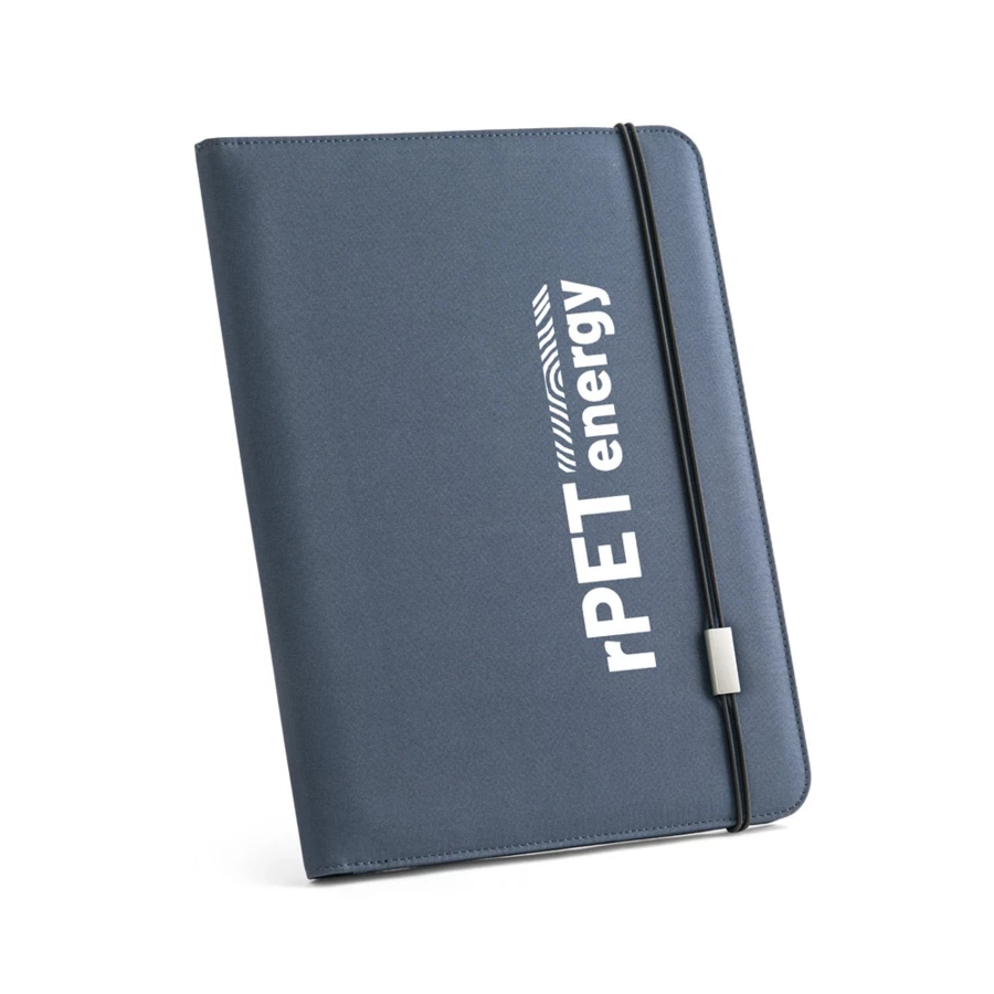 Teczka 300D poliestru pochodzącego (100% rPET) A4 z elastycznym zapięciem. Wnętrze z wieloma kieszeniami, uchwyt na długopis (długopis nie jest dołączony) i notatnik z 20 białymi stronami w linie. Dostarczany w etui non-woven. 230 x 330 x 50 mm