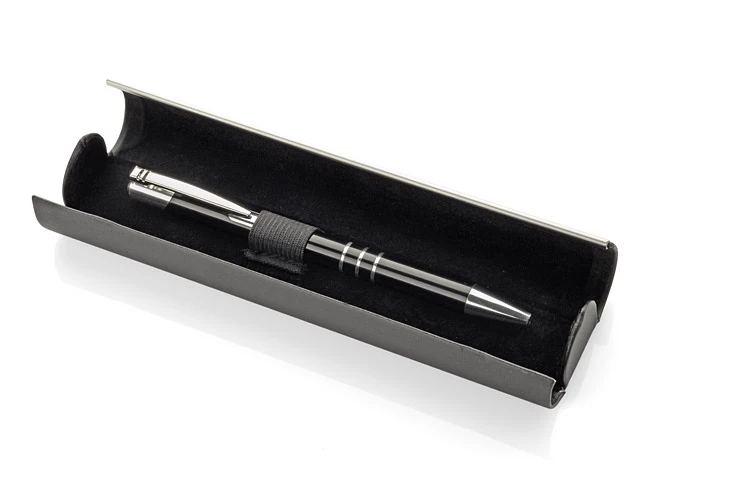Doskonały pomysł na zapakowanie dowolnego artykułu piśmienniczego. Niezwykle eleganckie, zamykane na magnesy etui z czarnego materiału skóropodobnego (PU) zachwyca wykonaniem oraz funkcjonalnością. Wnętrze wyłożone welurem posiada gumkę do mocowania jednego artykułu piśmienniczego. Zamknięcie ozdobione metalową blaszką, na której możliwe jest wykonanie znakowania. Pasuje do wszystkich modeli długopisów.