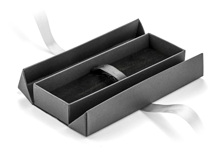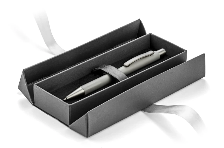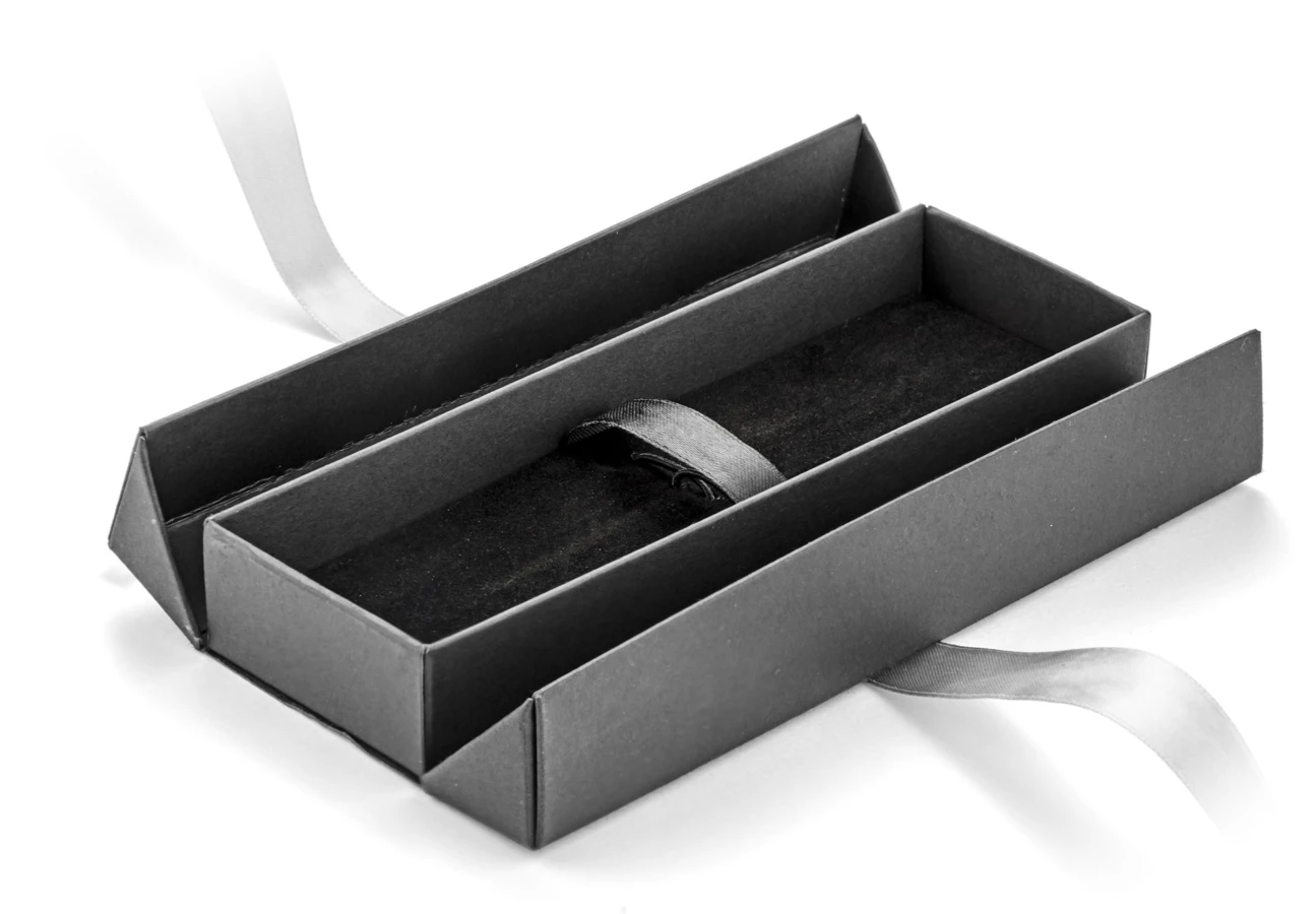 Etui do pakowania artykułów piśmienniczych wykonane z papieru. Zamykane za pomocą wstążki, którą można zawiązać w ozdobną kokardę.