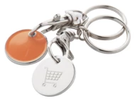 Metalowy brelok z żetonem do wózka na zakupy. Po jednej stronie żetonu wygrawerowany został wózek ma zakupy, druga strona jest pomalowana w kolorze. Wielkość żetonu: ø23×1,7 mm.