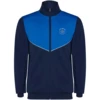 Dres z lekkiego i elastycznego materiału. Kurtka w kontrastowym kolorze z przeszyciami na klatce piersiowej. Wysoki kołnierz z kontrastowymi szwami. Zamek błyskawiczny po środku z przodu. Boczne kieszenie. Mankiety i talia wykończone ściągaczem 2x2. Spodnie z gumką w pasie i sznurkiem. Kontrastująca część z boku nogawki wykończona lamówką. Zamek błyskawiczny na dole nogawek.