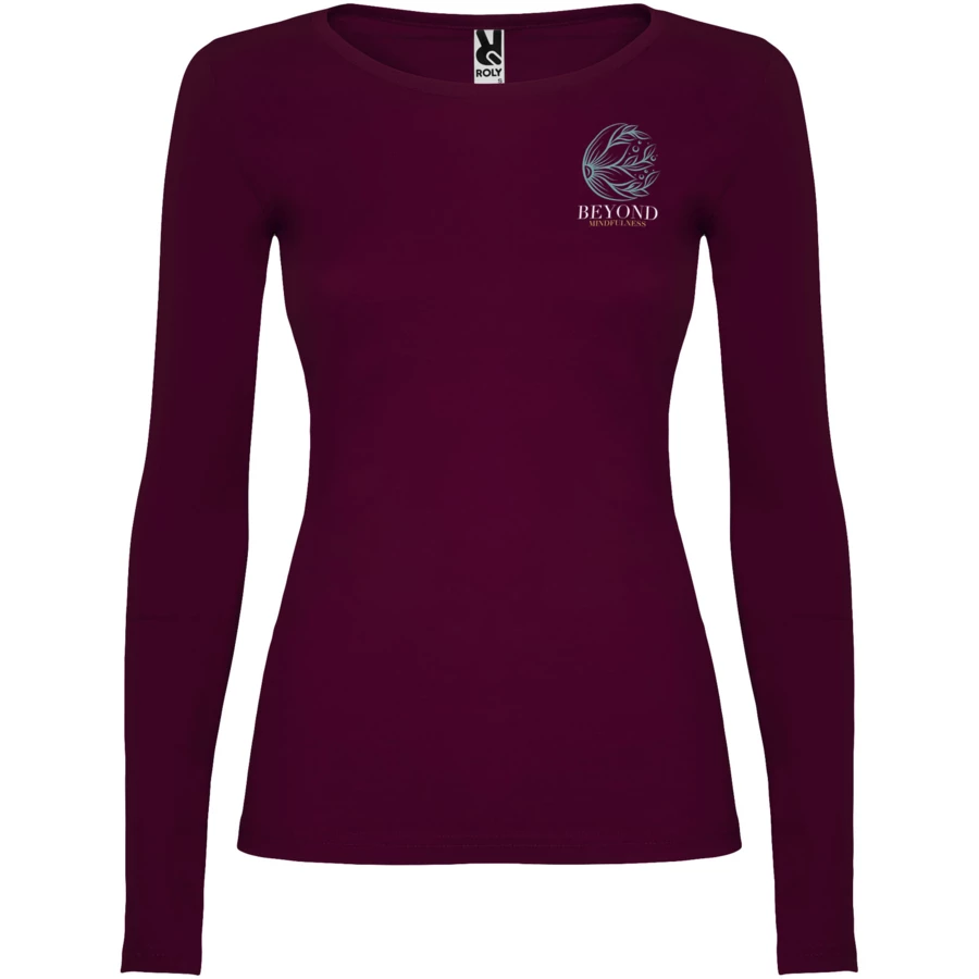 Częściowo dopasowana koszulka z długim rękawem i delikatnym wykończeniem przy szyi. Bez mankietów. Szwy boczne. Usuwalna metka.