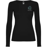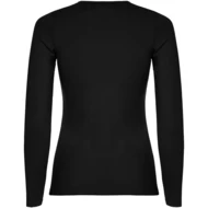 Częściowo dopasowana koszulka z długim rękawem i delikatnym wykończeniem przy szyi. Bez mankietów. Szwy boczne. Usuwalna metka.