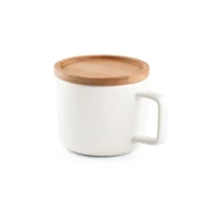 Kubek ceramiczny z pokrywką i bambusową podstawą. Pojemność do 220 mL. Dostarczany w pudełku upominkowym z papieru kraft. Kubek nadaje się do mycia w zmywarce i jest odporny na co najmniej 125 cykli mycia (w tym nadruk) zgodnie z normą EN12875-1. Ponieważ produkt jest wykonany z naturalnych materiałów, kolor produktu oraz wynik drukowania mogą się różnić w zależności od produktu. ø84 x 68 mm