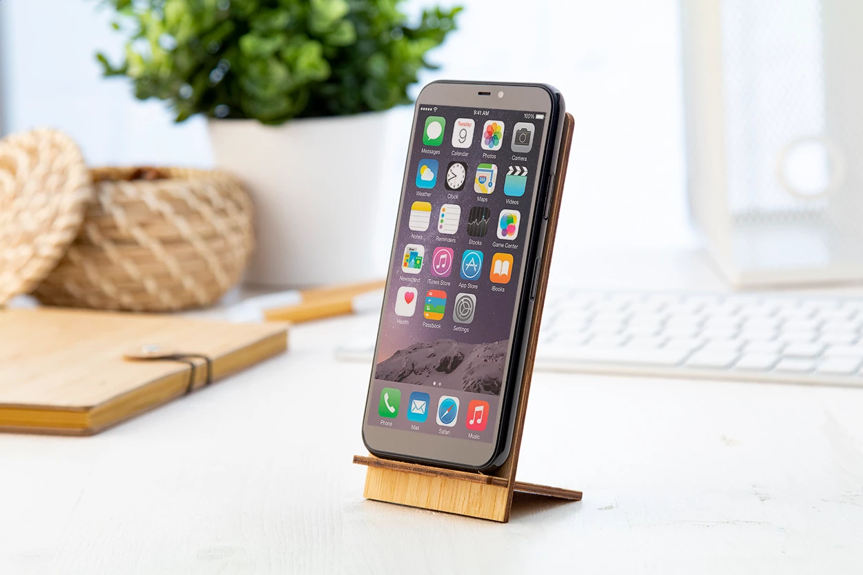 Uchwyt biurkowy na telefon ze sklejki bambusowej. Dostarczany na płasko.