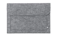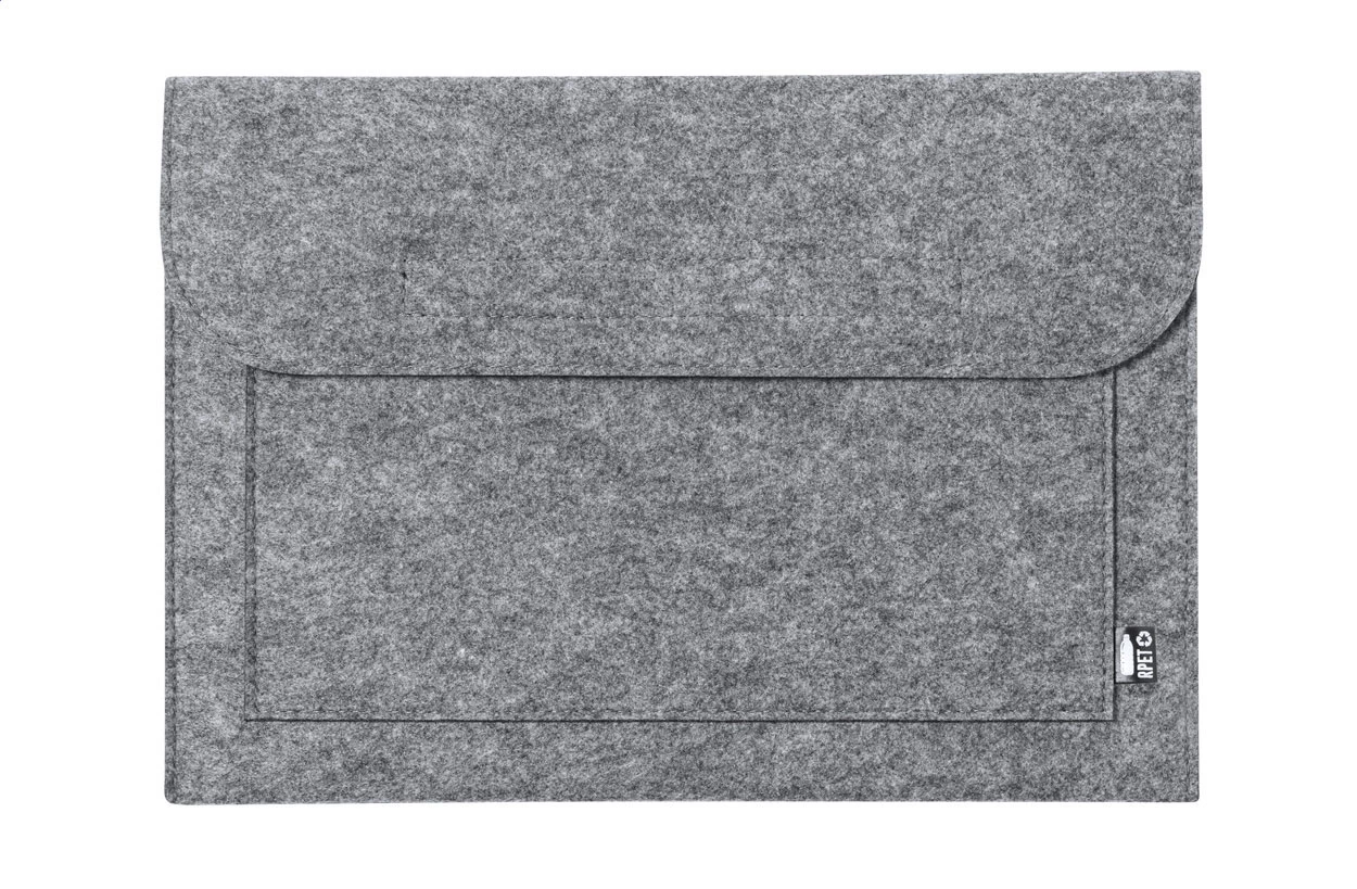 Filcowy pokrowiec na laptopa RPET z przednią kieszenią i zapięciem na rzep. Z charakterystyczną metką RPET.