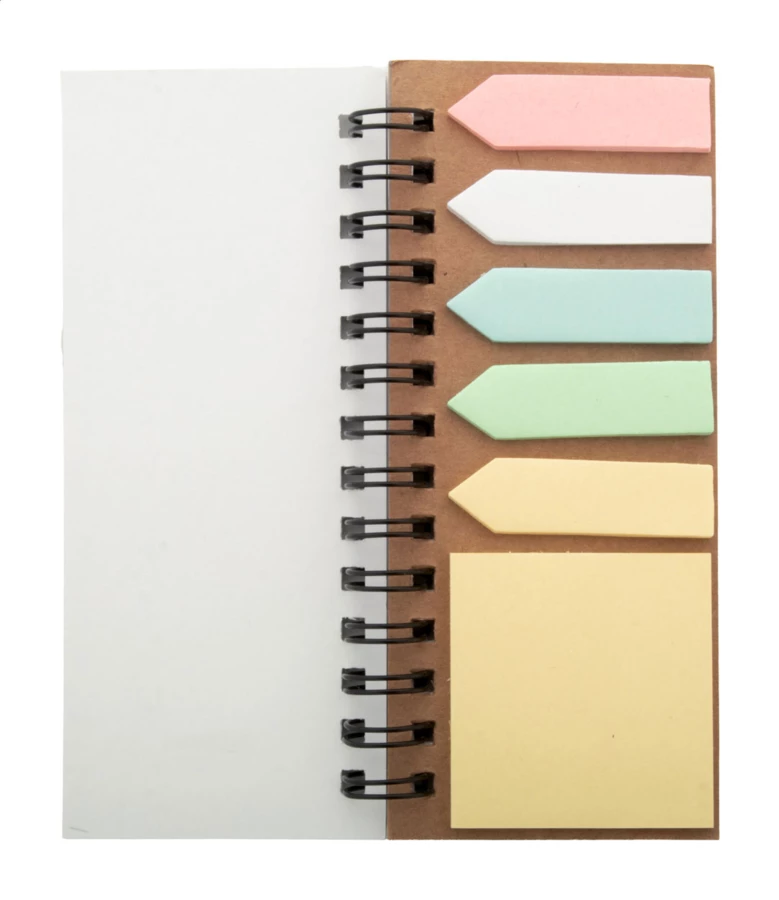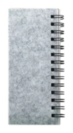Notes spiralny RPET, pokryty filcem, zawierający 40 kartek w linie z papieru pochodzącego z recyklingu, 25 karteczek samoprzylepnych i 125 zakładek (w 5 różnych kolorach).