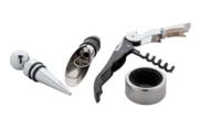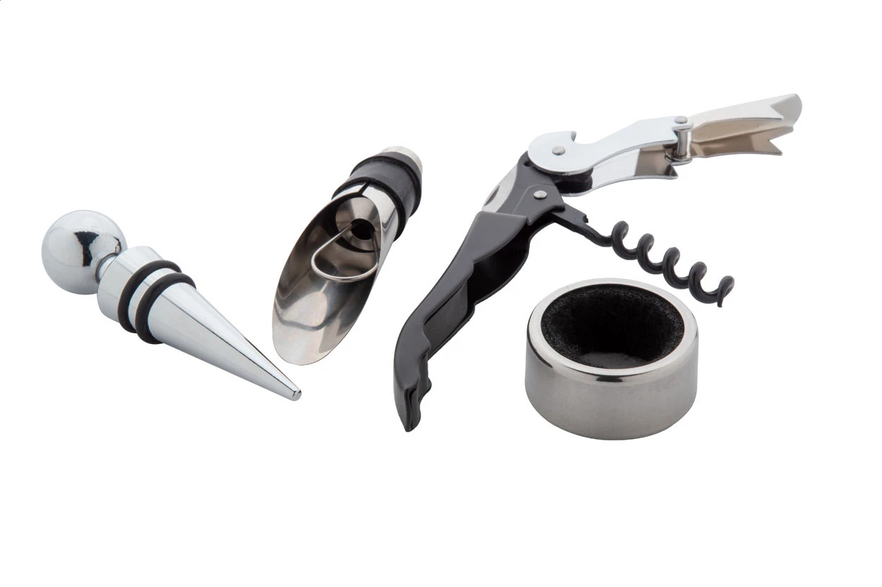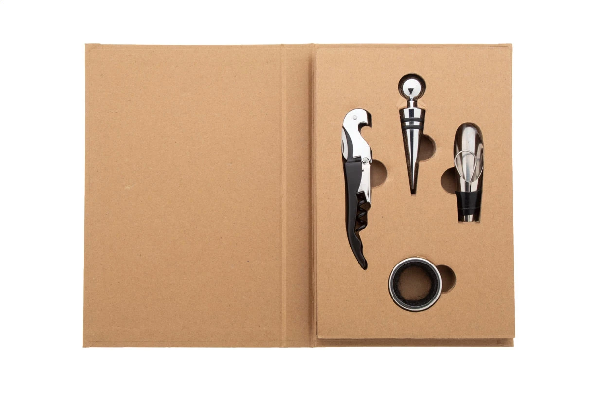 4-częściowy zestaw do wina ze stali nierdzewnej w pudełku w kształcie książki z papieru kraft z recyklingu. Zawiera korkociąg, ociekacz, lejek i zatyczkę.