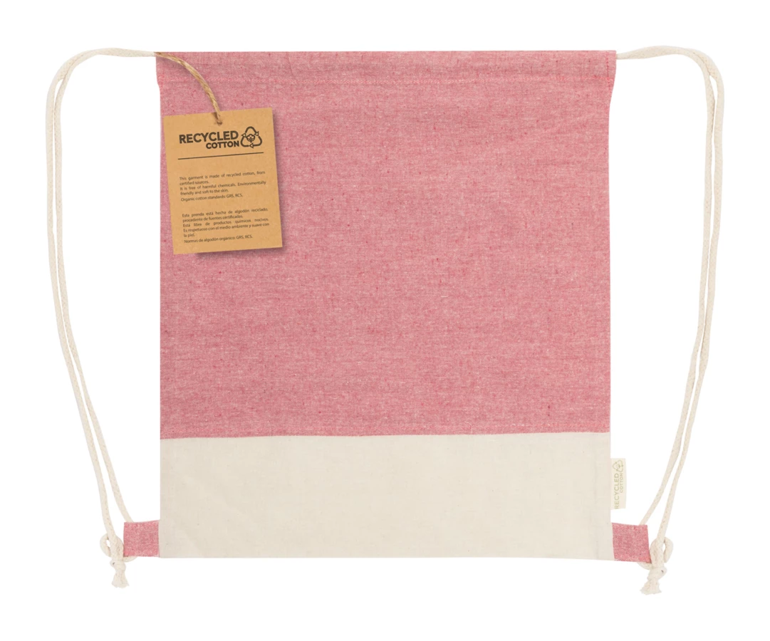 Dwukolorowy worek ze sznurkiem z bawełny pochodzącej z recyklingu z charakterystyczną metką informującą o bawełnie pochodzącej z recyklingu. 100% bawełna z recyklingu, 120 g/m².