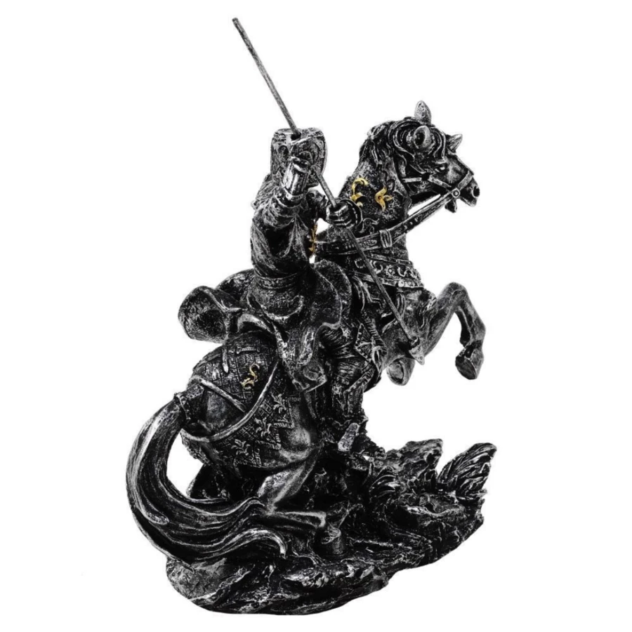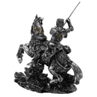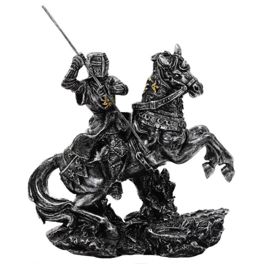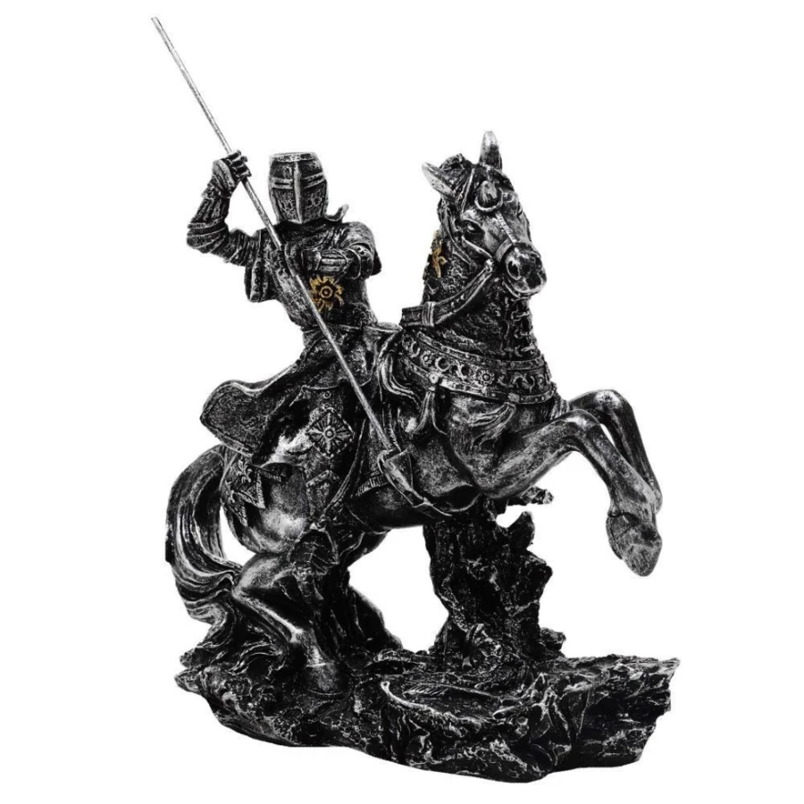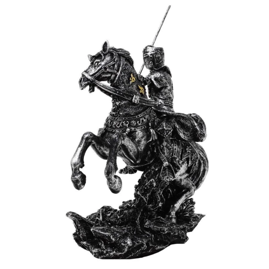 Figurka rycerza z włócznią na koniu to ciekawy element dekoracyjny – idealny do wnętrz o męskim charakterze lub jako dodatek do kolekcji militariów. Figurka wyróżnia się bogactwem detali: realistyczna zbroja, dynamiczna poza, ręczne malowanie z postarzaną srebrną patyną i złotymi akcentami.
