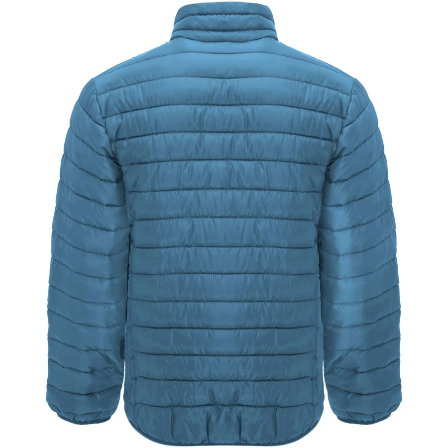 Męska kurtka pikowana z wypełnieniem imitującym w dotyku pierze. Odwrócone zamki błyskawiczne z dopasowanym ochraniaczem podbródka i ściągaczem. Dwie przednie kieszenie z zamkami błyskawicznymi. Dopasowana elastyczna lamówka w kołnierzu, mankietach i u dołu. Kontrastowa podszewka wewnętrzna. W zestawie torba transportowa. Lekka i składana odzież. Usuwalna metka. Wodoodporna. Wiatroszczelna.