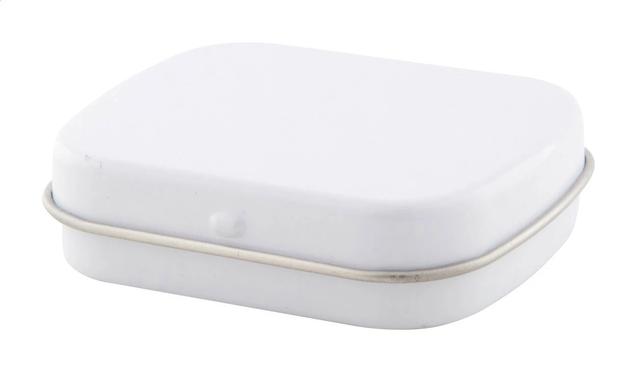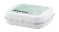 Prostokątne pudełko blaszane o pojemności ok. 25 gramów zawierające cukierki miętowe.