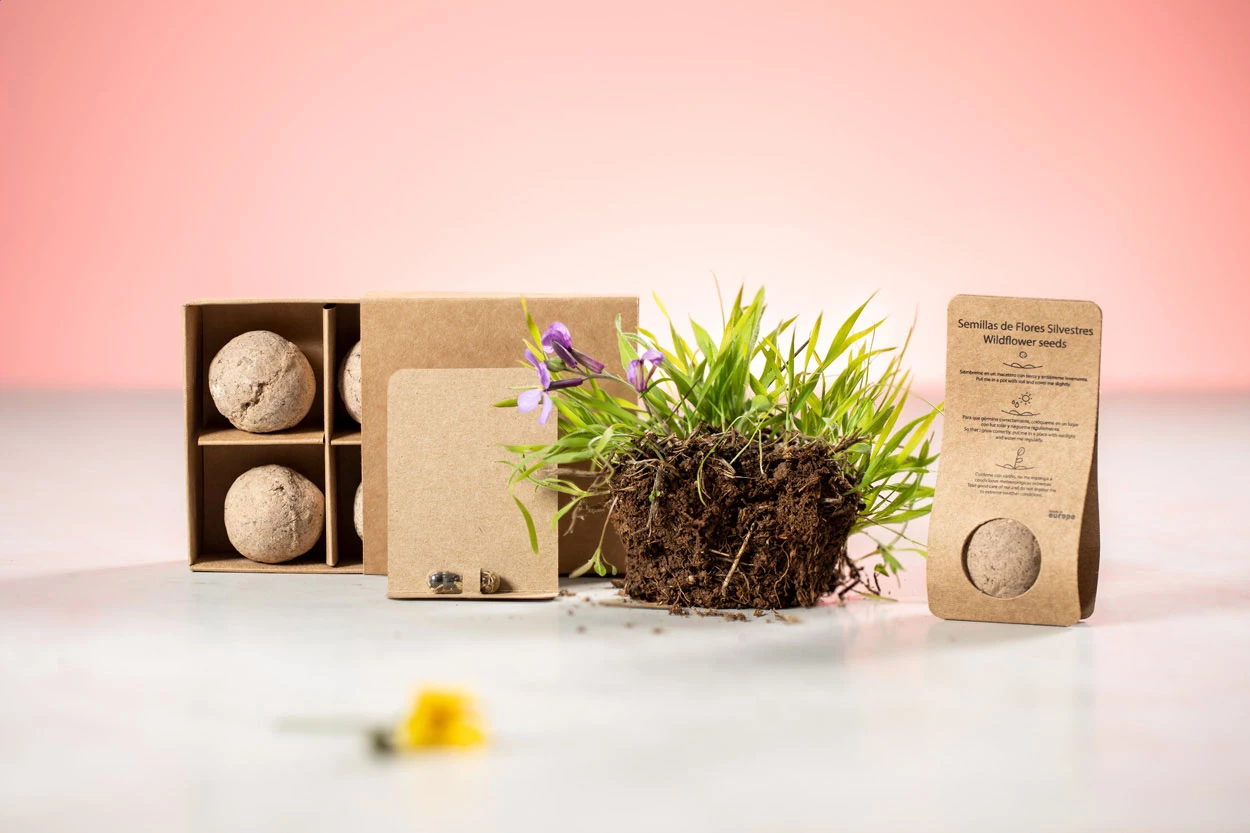Kula z nasionami dzikich kwiatów, w uchwycie z papieru z recyklingu.
