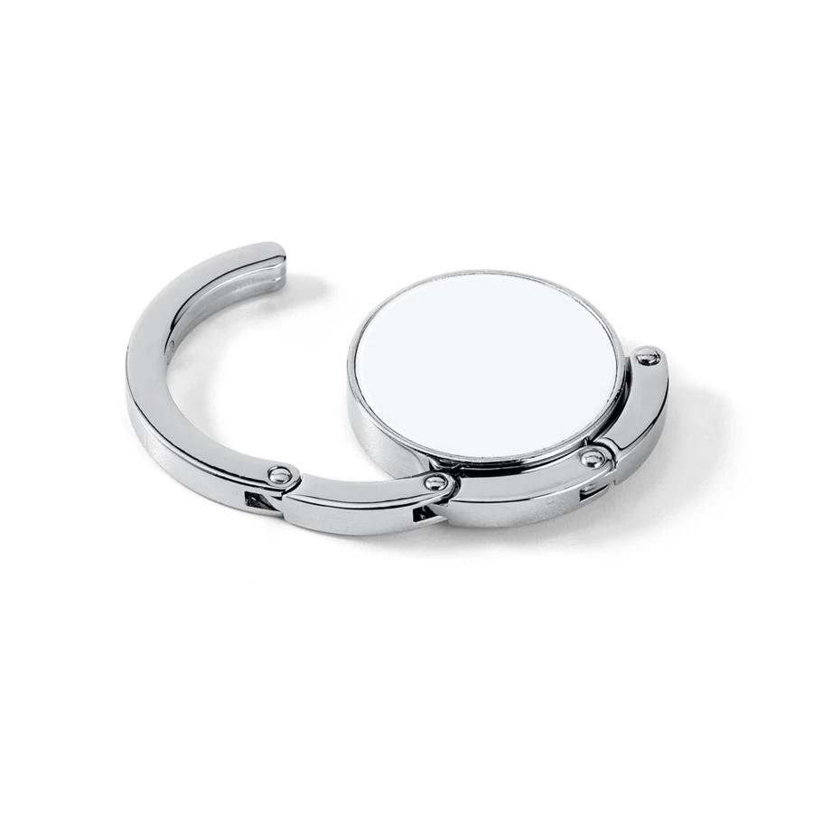 Solidny metalowy uchwyt na walizkę. Uchwyt można umieścić na powierzchni, aby zawiesić walizkę. Po schowaniu pozostaje blisko podstawy dzięki magnesowi. ø45 x 8 mm